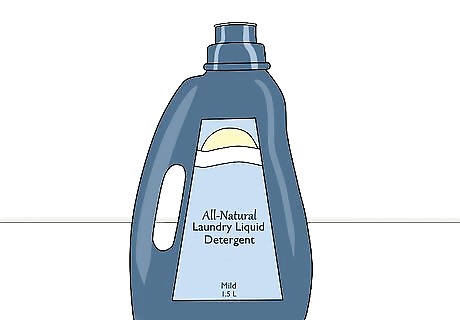 Use a mild or all-natural liquid detergent. Biodegradable detergents and those designed for delicate types of clothing are a good choice. The harsh chemicals found in regular and extra-strength detergents can gradually break down organic fabrics like linen. Stay away from powdered soaps and detergent. These can easily get trapped in the tightly-woven fabric, leading to inconsistent cleaning and more rapid deterioration.Tip: Look for detergents that use water and plant-based surfactants as their primary active ingredients.
