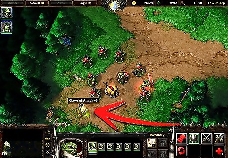 Level up your hero. Just as your hero and a grunt finishes training, send them to a green dot on the map close to your base. Have them focus on one creep at a time. If you see any chests or books [tomes] drop from the creeps when they die, right click on them. If it is a potion, only use it when you're low on health for health potions, or low on mana with mana potions.