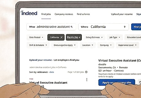 Search for administrative assistant positions. Contact prior employers. If you left a position on good terms, this is often a good way to work from home as an administrative assistant. As a trusted and productive employee, prior employers might offer work that can be performed from home. Search job websites for virtual positions. Many employers post administrative assistant positions using words like "telecommute," "remote," "virtual" or "work at home." Filter jobs by using these keywords. Join virtual assistant discussion groups. Potential clients sometimes post open positions on these forums.