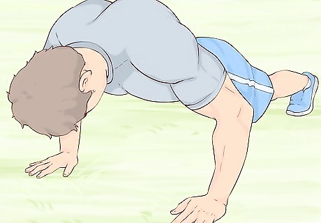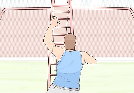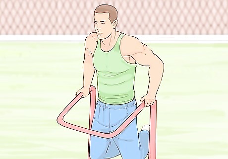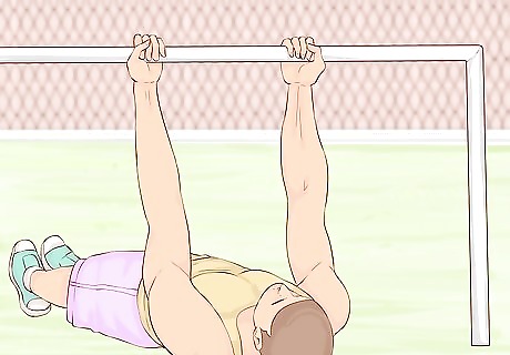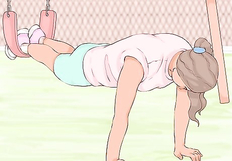 Do parallel and straight bar dips. If the playground has parallel bars or a single high bar, you can do dips to build the strength in your chest and shoulder muscles, as well as your triceps. Monkey bars also might work if the rungs are far enough apart. When you do these exercises, lean forward slightly on the way down and brace your torso, engaging your core to keep yourself stable. Grip the straight bar overhanded and extend your arms so that you're positioned with your torso over the bar. Leaning forward, brace your torso against the bar and lower until your elbows are bent behind you. Then raise back up and repeat. Do 10 repetitions of this exercise in a set. Parallel bar dips require a little less strength than straight bar dips, so if you have access to both, you may want to start on the parallel bars and use the straight bar as a progression once you've built more upper-body strength. Don't lower yourself too far when doing dips. This may increase your risk of injury.
