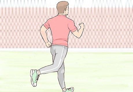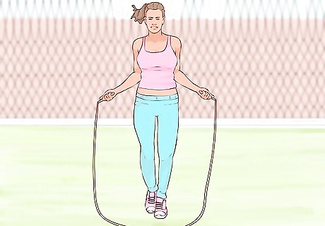Jog or jump rope. Jogging isn't necessarily a children's activity, but it's something that's easily accomplished in a park or around a playground. If you think you'd be embarrassed if people saw you skipping, then you might want to jog instead. Once you're warmed up, you might even consider challenging someone nearby to a short race. Most playgrounds don't have jump ropes lying around, but if you have one of your own you can bring it with you and do a little jumping as a warm-up. Set the timer on your watch or phone and jump at a regular pace for five minutes for an effective cardiovascular warm-up.