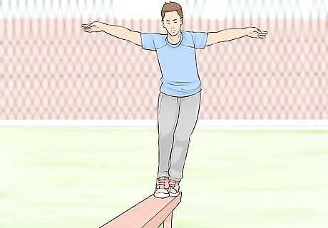 Walk on the balance beam. Most playgrounds have wooden beams of various elevations. Even if there isn't a specific balance beam, you may be able to find a slightly raised surface or a curb that you can use for the same purpose. Walk slowly at first until you find your balance. Turn and walk back slightly faster, then gradually increase your speed each time you cross. You also can lift each leg up to hip-height with each step, or add a kick to each step. Move your arms naturally at first, but you might experiment with clasping your hands behind your back or keeping your hands on your hips to see how that affects your balance.