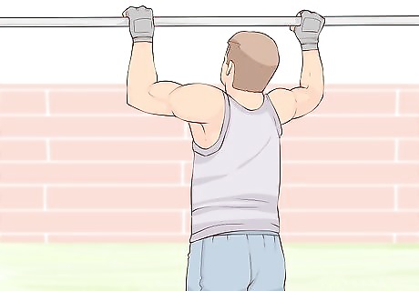 Start with eccentric pull-ups or chin-ups. If you can't accomplish more than one pull-up or chin-up, you may want to start with eccentric pull-ups or chin-ups and work your way up to the regular ones. To do an eccentric pull-up or chin-up, jump up and grab the bar – or climb and reach over. You want to be holding the bar with your head or chin above the bar. Hold that position for a second, then slowly lower yourself to the ground. Make sure you control the descent. This is the negative movement in a pull-up or chin-up, but is easier to do and will help build your muscles.