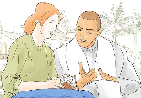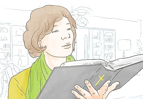 Get a Bible. Many religions have books that they refer to. The Bible is the main sacred text of Christianity. Studying the Bible and other such books can expand your knowledge of God, and in doing so you have more knowledge about how to do good works for Him and worship Him.