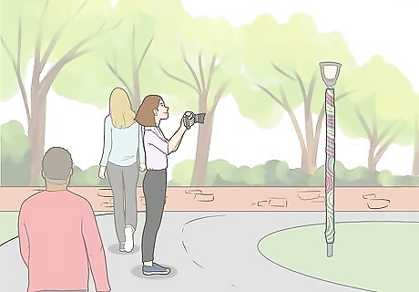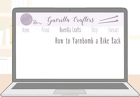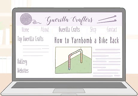 Yarn bomb large outdoor items or public fixtures, then post the photos. Yarn bombing is a common guerilla craft, so it’s a great topic for your blog. To yarn bomb, cover a large item like a bicycle or wheelbarrow with yarn and leave it in public. Alternatively, cover a park bench, bike ramp, or tree with yarn. Then, take photos and post about it. Start by yarn bombing your own yard. Then, take your efforts to the streets. If you see yarn bombing that someone else did, take a photo and write about where you found it and how it made you feel.Warning: You may get in trouble for yarn bombing public spaces, so check the laws in your area. For instance, you may get in trouble for defacing public property.