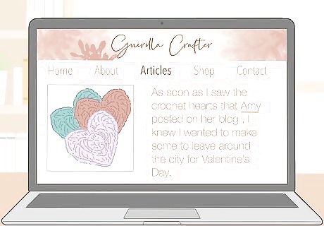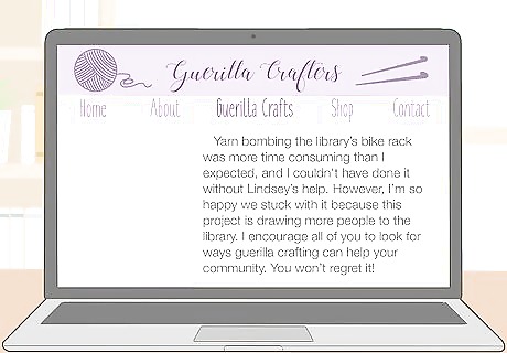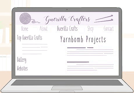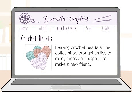 Leave crafts in public spaces and document the action on your blog. Guerilla crafting is partially about bringing crafts into the community. Place small crafts in places like park benches, coffee shops, and libraries. Take photos to document where you left the item, then write a story about it for your readers. When you leave the item, post on your social media so that people know where to find it.