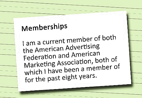 Include any professional advertising organization of which you are a member. Showing that you are a member of the American Advertising Federation, the American Marketing Association, the Society for Marketing Professional Services or a similar state wide association will show a dedication and interest in being part of the professional community. If you do not already belong to an association, you should consider joining.