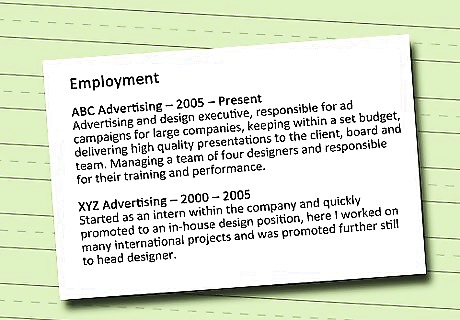 Include internships or jobs, either chronologically or functionally, if you don't have very much professional experience. Internships with major agencies where you have relevant experience can work to your advantage; however, serving or retail experience will not help you get a job if you are applying for a creative position like creative director. It may be easier to parlay retail or business jobs into relevant experience if you are apply for an account management or planning position with an agency.