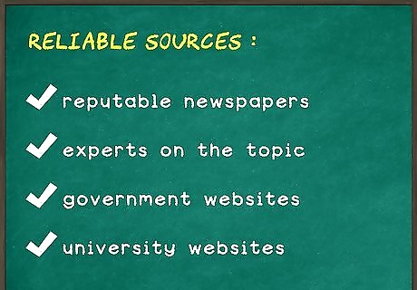 Use reliable sources. Be wary when researching online. Draw only from reliable sources like reputable newspapers, experts on the topic, government websites, or university websites. Scan for information that lists other sources, since this will help back up any claims made by your source. You can also find sources in print, and the same precautions should be taken there. Don’t assume that one source is completely accurate. You'll need several unrelated sources to get the full picture.