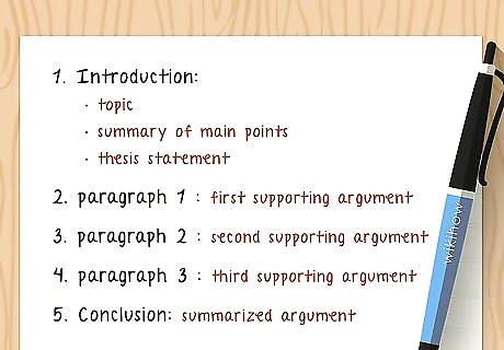 Outline your article. Before you begin to formally write, write up an outline of your article. This outline will break down which information goes where. It serves as a guide to help you figure out where you need additional information. It’s helpful to start with the five-paragraph essay outline. This outline devotes one paragraph to an introduction, three paragraphs for supporting evidence, and one paragraph for a conclusion. As you start plugging in information into your outline, you may find that this structure doesn’t suit your article so well. You might also find that this structure doesn’t suit certain types of articles. For example, if you’re doing a profile of a person, your article may follow a different format.