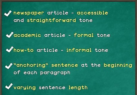 Pay attention to style, structure and voice. You will want to write with a style, structure, and voice which makes sense for the type of article you are writing. Evaluate your audience to determine what the best method would be to present your information to them. For example, a newspaper article will need to offer information in a narrative, chronological format. It should be written with accessible and straightforward language. An academic article will be written with more formal language. A how-to article might be written in more informal language. When writing your article, use a strong "anchoring" sentence at the beginning of each paragraph to move your reader forward. Moreover, vary the length of your sentences, both short and long. If you find all your sentences are about the same word length, chances are your reader will be 'lulled" into a standard rhythm and fall asleep. Sentences which are consistently choppy and short may give your reader the impression you are writing advertising copy instead of a well-thought-out article.
