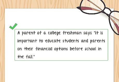 Choose quotes and other evidence to support your points. You will likely come across information that succinctly supports what you’re saying. This might include a statement that someone has made, or a sentence within another article that is particularly relevant. Choose the most important and descriptive part to use in your piece. Add these quotes to your outline. Make sure to fully attribute your quote and use quotation marks around anything that you didn’t write yourself. For example, you might write: A spokesperson for the dairy brand Milktoast says, “Our milk is labeled organic because our cows are only fed organic grass.” Don’t overdo the quotes. Be selective about the quotes you do use. If you use too many quotes, your reader might think you’re using them as filler instead of coming up with your material.