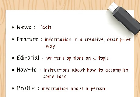 Get familiar with the type of article you want to write. As you’re figuring out your topic and focus, think about the type of article that will best suit the points that you want to convey. Some article types are better suited to certain topics. Some of the most common types of articles are: News: This type of article presents facts about something that happened recently or that will happen in the near future. It usually covers the 5 Ws and H: who, what, where, when, why and how. Feature: This type of article presents information in a more creative, descriptive way than a straight news article. It can be an article about a person, a phenomenon, a place, or other subject. Editorial: This article presents a writer’s opinions on a topic or debate. It is intended to persuade the reader to think a certain way about a topic. How-to: This article gives clear instructions and information about how to accomplish some task. Profile: This article presents information about a person, using information that the writer typically gathers through interviews and background research.