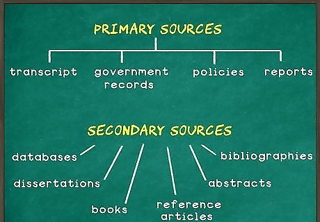 Learn about your topic and argument. Start researching your specific topic and argument. Go beyond the preliminary research you already conducted. Learn the fundamental issues at stake, the pros, and cons, what the experts say, and so on. The best writers have a "documents state of mind." They search both for primary (original, unpublished) documents and secondary documents on that subject. Primary sources can include a transcript from a legislative hearing, lawsuit filing, county property indexes with folio numbers, discharge certificates from the military, and photos. Other primary sources could include government written records in the National Archives or special collections sections of your local or university library, insurance policies, corporate financial reports, or personal background reports. Secondary sources comprise published databases, books, abstracts, articles in English and other languages, bibliographies, dissertations, and reference books. You can find information on the internet or in a library. You can also conduct interviews, watch documentaries, or consult other sources.