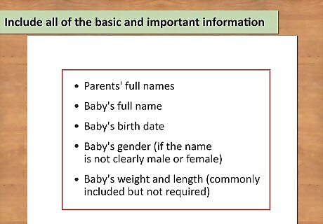 Include all of the basic and important information. This information is the core of the birth announcement and will include everything someone will need to know to be well-informed about the birth of the baby. Make sure to include the following: Parents' and grandparents' full names. You can choose to include middle names, initials, or not. The baby’s full name. The baby's birth date. The baby's gender. You can choose to leave this out, but it might be helpful if the gender is not clear from the baby’s name. The baby's weight and length. This is often included but not required.