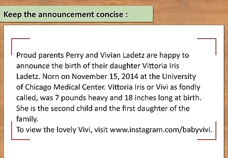 Revise the birth announcement as needed. Make sure to edit the announcement before turning it in. Check for typos and any extra words you don’t need. Have a friend or family member read it. Also, run it by your partner to make sure he or she approves. Ensure that it meets the guidelines set by the paper before sending it in, including the word count. If you’re not the parents, run it by them. Don’t be afraid to move things around or to add or subtract if you don’t feel the announcement is right.