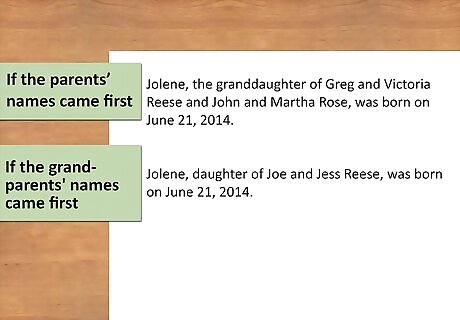 Move on to the name of the baby, date of birth, and the names of parents or grandparents. Here is your opportunity to squeeze in the names of the parents or the grandparents depending on whose name came first. If the grandparents' names came first, you can now use the parents name. For example: “Jolene, daughter of Joe and Jess Reese, was born on June 21, 2014.” If the parents’ names came first, you can now use the grandparents' names. For example: “Jolene, the granddaughter of Greg and Victoria Reese and John and Martha Rose, was born on June 21, 2014. Depending on circumstances, like if grandparents are deceased or are putting out their own announcement in their own community, you can leave out one set of grandparents.
