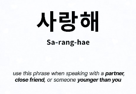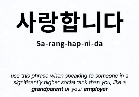Sa-rang-hap-ni-da (사랑합니다)While still a version of the “sa-rang-ha-da” verb, sa-rang-hap-ni-da is far more formal than “sa-rang-hae” or “sa-rang-hae-yo.” You only use this phrase when speaking to someone in a significantly higher social rank than you, like a grandparent or your employer. Just like with “sa-rang-hae-yo,” add the “ssi” (씨) suffix when referring to someone by their name. “Sa-rang-hap-ni-da, hal-meo-ni” (사랑합니다, 할머니) translates to “I love you, grandma.” “Sa-rang-hap-ni-da, Ji-yun-ssi” (사랑합니다, 지윤씨) translates to “I love you, Jiyoon.” Learn romantic phrases for real conversations. "I wanted to learn Korean, so I could talk to my girlfriend in a more heartfelt way. The article gave me actual romantic phrases I can use, not just stiff textbook sentences. Now, I can say things like "I miss you" or "I can't live without you" in a way that sounds natural but still romantic. It really brings us closer when I can express my feelings in her native language." - Peter T. Tailor your speech to show respect. "I used to feel awkward talking to my Korean girlfriend's parents since I didn't know the right level of formality to use. This article explained how speaking casually to your friends is different than talking politely to parents and elders. Knowing when to use formal phrases helps me make a good impression on her family and show respect." - John Kervy B. Practice pronouncing loving words. "As someone just starting to learn Korean, I found the tips on how to pronounce "I love you" super helpful. I was able to practice saying the phrases out loud, thanks to the breakdown of the sounds. My speaking skills have definitely improved from repeating these loving words until I get the pronunciation just right." - Joyce S. Use pet names for sweetness. "I loved learning classic Korean pet names to call my partner. Sprinkling in words like "jagiya" (baby) and "nae sarang" (my love) adds some cute romance to our daily conversations. It's a simple way to surprise him and keep things feeling sweet." - Kitty B. Did you know that wikiHow has collected over 365,000 reader stories since it started in 2005? We’d love to hear from you! Share your story here.