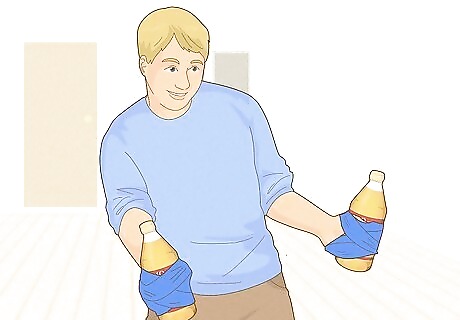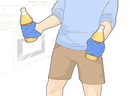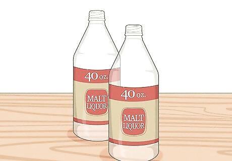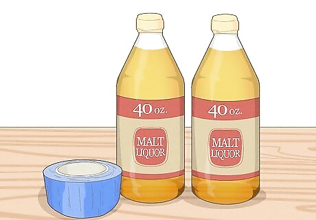 Use duct tape to attach two 40-oz malt liquors to your hands. Tape one 40-oz bottle of malt liquor to your left hand and one to your right. Make sure they’re already open as well. You wouldn’t want to tape the bottles to your hands without even being able to drink them! Tip: Tape the bottles at the neck so your hands don’t warm up the beer. You only need two or more people to play Edward 40 Hands. One person will have to help you tape the 40s to your hands (and remove them when you're done).