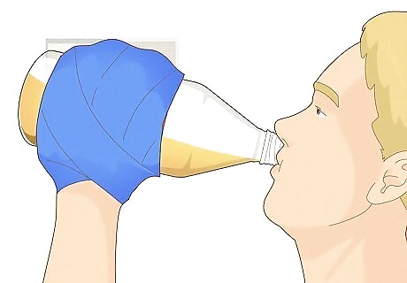 Finish the bottles as quickly and safely as you can. Safety is key here. The goal of Edward 40 Hands is to finish your 2 40-oz drinks as fast as you can so you can safely use your hands and go to the bathroom, but doing so too quickly can be dangerous. So, you’ll want to be a little quick while still remembering to pace yourself. Consider having a sip of water between your sips of beer to make sure you stay hydrated, and stay close to the bathroom just in case the seal breaks before you do. Tip: Aim to finish at least one drink so you have a free hand to go to the bathroom. While the goal is to finish the drinks as soon as possible, don’t just chug your drinks to get them out of your hands. That could lead to stomachaches and alcohol-related complications. Ask someone you trust to be your buddy for when you need to go to the bathroom. That way, they can help you get your pants off if needed.