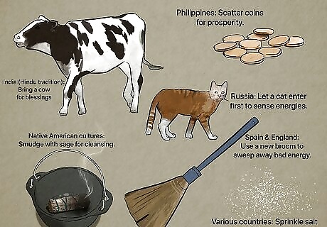 Traditions from around the world The Chinese aren’t the only ones with unique housewarming rituals and traditions. Many cultures from around the world have different practices believed to promote good luck and prosperity. Here are some examples: In Hindu tradition, bringing a cow into your home serves as a blessing. Hindus also boil milk until it overflows, then share it with friends and family as a symbol of family members sharing joy and sorrow equally. In Russia, homeowners let a cat enter their home first, as cats are believed to be able to sense positive and negative energies. In the Philippines, people scatter coins around their new living room to promote prosperity. In Spain, England, and other countries, it isn’t a good idea to bring an old broom to a new house. Replacing it with a new one symbolizes sweeping away bad energy and ushering in a fresh start. Some Native American cultures use sage and sacred herbs to smudge homes for spiritual cleansing and blessings. Various countries encourage sprinkling salt in the corners of a new home to remove negative energy.